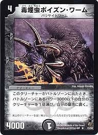 毒煙虫ポイズン・ワーム R 闇文明 (4) クリーチャー:パラサイトワーム 4000 このクリーチャーがバトルゾーンに出たとき、バトルゾーンにあるパワー3000以下の自分のクリーチャーを1体選び、自分の墓地に置く。