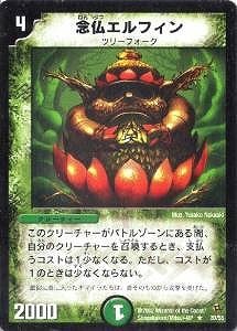 念仏エルフィン R 自然文明 (4) クリーチャー:ツリーフォーク 2000 自分のクリーチャーを召喚する時、支払うコストは1少なくなる。ただし、コストは1より少なくならない。