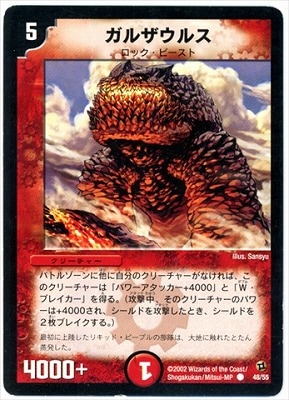 ガルザウルス C 火文明 (5) クリーチャー:ロック・ビースト 4000+ バトルゾーンに他に自分のクリーチャーがなければ、このクリーチャーは「パワーアタッカー+4000」と「W・ブレイカー」を得る。