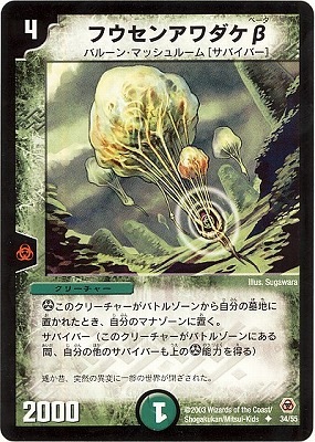 フウセンアワダケβ(ベータ) UC 自然文明 (4) クリーチャー:バルーン・マッシュルーム[サバイバー] 2000 SV−このクリーチャーがバトルゾーンから自分の墓地に置かれたとき、自分のマナゾーンに置く。 サバイバー(このクリーチャーがバトルゾーンにある間、自分の他のサバイバーも上のSV能力を得る)