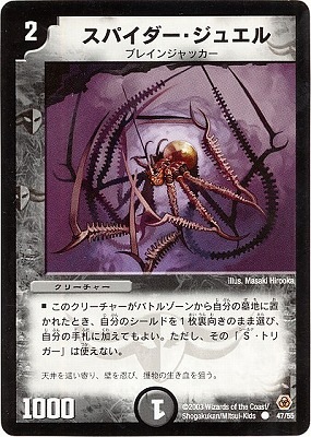 スパイダー・ジュエル C 闇文明 (2) クリーチャー:ブレインジャッカー 1000 このクリーチャーが破壊された時、自分のシールドを1枚選び、自分の手札に加えてもよい。(その「S・トリガー」能力は使えない)