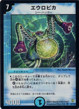 エウロピカ VR 水文明 (7) クリーチャー:シー・ハッカー 4000 このクリーチャーで攻撃するかわりに、タップして次のTT能力を使ってもよい。 TT−バトルゾーンにあるクリーチャーを1体選び、持ち主の手札に戻す。
