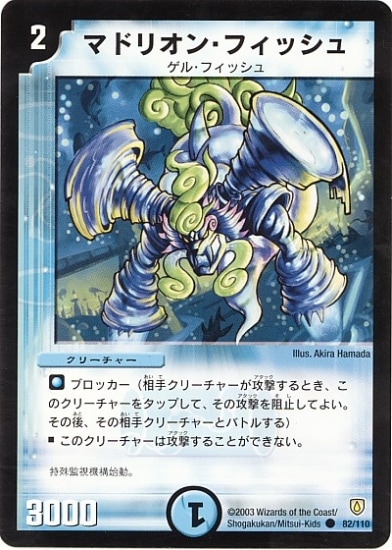 マドリオン・フィッシュ C 水文明 (2) クリーチャー:ゲル・フィッシュ 3000 ブロッカー このクリーチャーは攻撃することができない。
