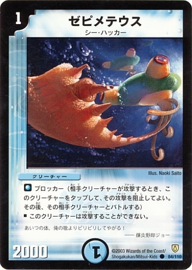 ゼピメテウス C 水文明 (1) クリーチャー:シー・ハッカー 2000 ブロッカー このクリーチャーは攻撃することができない。