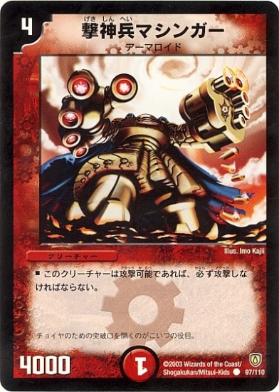 撃神兵マシンガー C 火文明 (4) クリーチャー:アーマロイド 4000 このクリーチャーは、可能であれば毎ターン攻撃する。