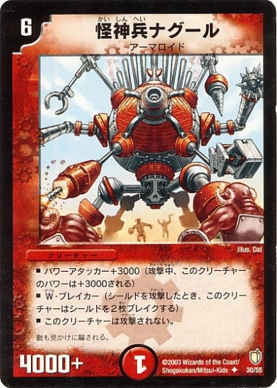怪神兵ナグール UC 火文明 (6) クリーチャー:アーマロイド 4000+ パワーアタッカー+3000 W・ブレイカー このクリーチャーは攻撃されない。
