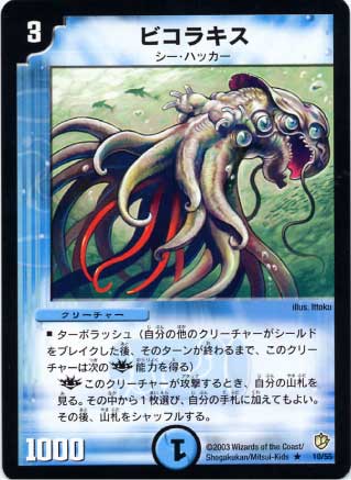 ビコラキス R 水文明 (3) クリーチャー:シー・ハッカー 1000 ターボラッシュ TR−このクリーチャーが攻撃するとき、自分の山札を見る。その中から1枚選び、自分の手札に加えてもよい。その後、山札をシャッフルする。