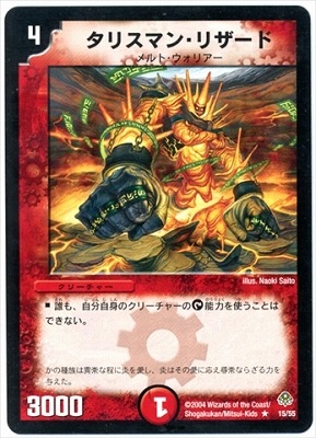 タリスマン・リザード R 火文明 (4) クリーチャー:メルト・ウォリアー 3000 誰も、自分自身のクリーチャーのタップ能力を使うことはできない。