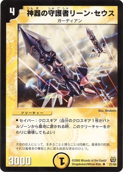 神器の守護者リーン・セウス UC 光文明 (4) クリーチャー:ガーディアン 3000 セイバー:クロスギア(自分のクロスギア1枚がバトルゾーンから墓地に置かれる時、このクリーチャーをかわりに破壊してもよい)