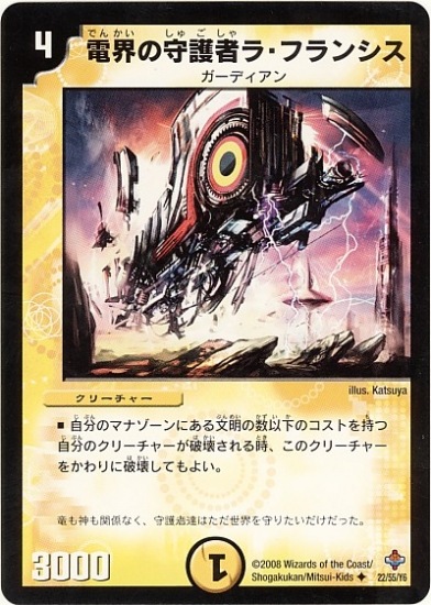 電界の守護者ラ・フランシス UC 光文明 (4) クリーチャー:ガーディアン 3000 自分のマナゾーンにある文明の数以下のコストを持つ自分のクリーチャーが破壊される時、このクリーチャーをかわりに破壊してもよい。