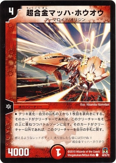 超合金マッハ・ホウオウ C 火文明// (4) 進化クリーチャー:アーマロイド/オリジン 4000 デッキ進化−自分の山札の上から1枚目を表向きにする。そのカードがクリーチャーであれば、このクリーチャーをその上に重ねつつバトルゾーンに出す。そのカードがクリーチャー以外であれば、このクリーチャーを自分の手札に戻す。