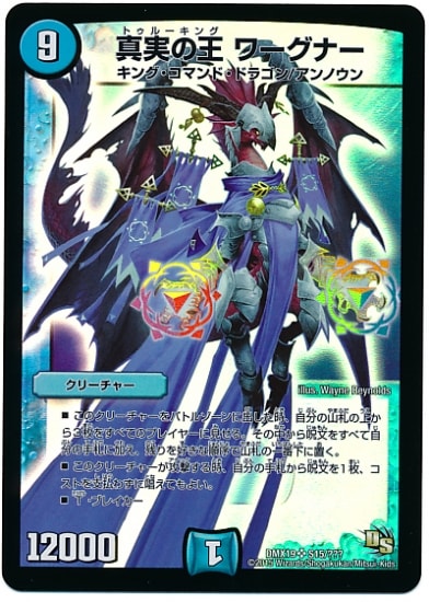 【カードの光り方は全て同じ在庫として管理しております。ご購入の際にお選びすることができませんので予めご了承ください。】 真実の王(トゥルーキング) ワーグナー SR 水文明 (9) クリーチャー:キング・コマンド・ドラゴン/アンノウン 12000 このクリーチャーをバトルゾーンに出した時、自分の山札の上から3枚をすべてのプレイヤーに見せる。その中から呪文をすべて自分の手札に加え、残りを好きな順序で山札の一番上に戻す。 このクリーチャーが攻撃する時、自分の手札から呪文を1枚、コストを支払わずに唱えてもよい。 T・ブレイカー
