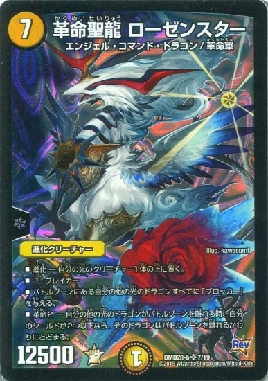 12500 進化−自分の光のクリーチャー1体の上に置く。 T・ブレイカー バトルゾーンにある自分の他の光のドラゴンすべてに「ブロッカー」を与える。 革命2−自分の他の光のドラゴンがバトルゾーンを離れる時、自分のシールドが2つ以下なら、そのドラゴンはバトルゾーンを離れるかわりにとどまる。