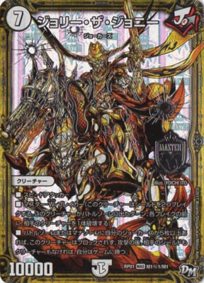 ジョリー・ザ・ジョニー MAS 無色[ジョーカーズ] (7) クリーチャー:ジョーカーズ 10000 スピードアタッカー マスター・W・ブレイカー(このクリーチャーはシールドを2つブレイクする。このクリーチャーがバトルゾーンに出たターン、各ブレイクの前に、相手のクリーチャーを1体破壊する。) バトルゾーンまたはマナゾーンに自分のジョーカーズが5枚以上あれば、このクリーチャーはブロックされず、攻撃の後、相手のシールドもクリーチャーもなければ、自分はゲームに勝つ。