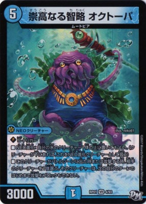 崇高なる智略 オクトーパ VR 水文明 (5) NEOクリーチャー:ムートピア 3000 S・トリガー NEO進化:自分の水のクリーチャー1体の上に置いてもよい。(クリーチャーが下にあれば、これをNEO進化クリーチャーとして扱う) このクリーチャーがバトルゾーンに出た時または攻撃する時、相手のクリーチャーを1体選ぶ。そのクリーチャーは、次の自分のターンのはじめまで攻撃もブロックもできない。