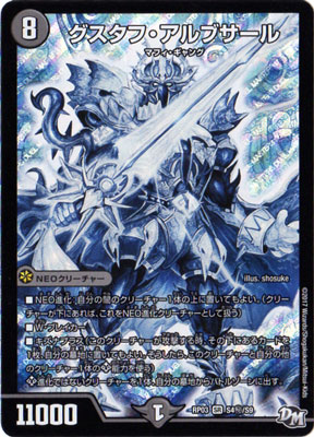 グスタフ・アルブサール SR 闇文明 (8) NEOクリーチャー:マフィ・ギャング 11000 NEO進化:自分の闇のクリーチャー1体の上に置いてもよい。 W・ブレイカー キズナプラス(このクリーチャーが攻撃する時、その下にあるカードを1枚、自分の墓地に置いても良い。そうしたら、このクリーチャーと自分の他のクリーチャー1体のKP能力を使う) KP−進化ではないクリーチャーを1体、自分の墓地からバトルゾーンに出す。