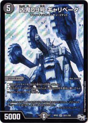 凶鬼09号 ギャリベータ SR 闇文明 (5) クリーチャー:マフィ・ギャング/デーモン・コマンド 5000 このクリーチャーを、自分の墓地から召喚してもよい。 自分のターンの終わりに、自分の山札の上から2枚を墓地に置いてもよい。そうしたら、カードを1枚引く。