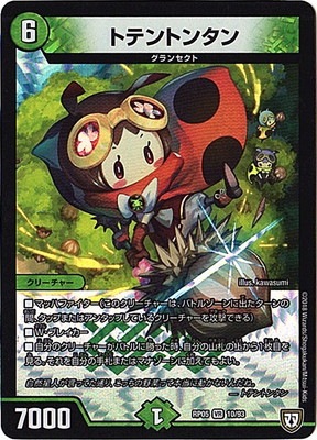 トテントンタン VR 自然文明 (6) クリーチャー:グランセクト 7000 マッハファイター W・ブレイカー 自分のクリーチャーがバトルに勝った時、自分の山札の上から1枚目を見る。それを自分の手札またはマナゾーンに加えてもよい。