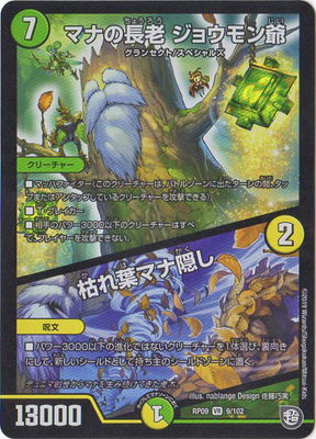 マナの長老 ジョウモン爺 VR 自然文明 (7) クリーチャー:グランセクト/スペシャルズ 13000 マッハファイター(このクリーチャーは、バトルゾーンに出たターンの間、タップまたはアンタップしているクリーチャーを攻撃できる) T・ブレイカー 相手のパワー3000以下のクリーチャーはすべて、プレイヤーを攻撃できない。 枯れ葉マナ隠し VR 光文明 (2) 呪文 パワー3000以下の進化ではないクリーチャーを1体選び、裏向きにして、新しいシールドとして持ち主のシールドゾーンに置く。