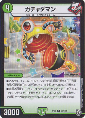 ガチャダマン R 自然文明[ジョーカーズ] (4) クリーチャー:ジョーカーズ/ワンダフォース 3000 このクリーチャーがバトルゾーンに出た時、GR召喚する(GR召喚:自分の超GRの上から1枚目を、コストを支払ったものとして召喚する) 自分のGRクリーチャーすべてに「マッハファイター」を与える。
