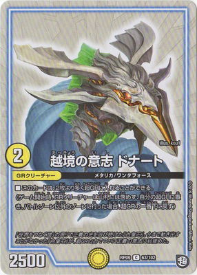 越境の意志 ドナート C 光文明 (2) GRクリーチャー:メタリカ/ワンダフォース 2500 このカードは、2枚より多く超GRに入れることができる。 (ゲーム開始時、GRクリーチャーは山札には含めず、自分の超GRに置き、バトルゾーン以外のゾーンに行った場合、超GRの一番下に戻す)