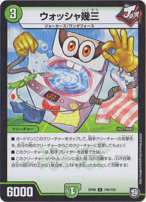 ウォッシャ幾三 C 自然文明[ジョーカーズ] (3) クリーチャー:ジョーカーズ/ワンダフォース 6000 ガードマン(このクリーチャーをタップして、相手クリーチャーの攻撃先を、自分の他のクリーチャーに変更してもよい。) このクリーチャーは、相手プレイヤーを攻撃できない。 このクリーチャーがバトルゾーンに出た時、GR召喚する。(GR召喚:自分の超GRの上から1枚目を、コストを支払ったものとして召喚する)