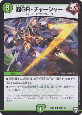超GR・チャージャー C 自然文明[ジョーカーズ] (3) 呪文:ジョーカーズ/ワンダフォース GR召喚する。(GR召喚:自分の超GRの上から1枚目をコストを支払ったものとして召喚する。) チャージャー(この呪文を唱えた後、墓地に置くかわりにマナゾーンに置く。)