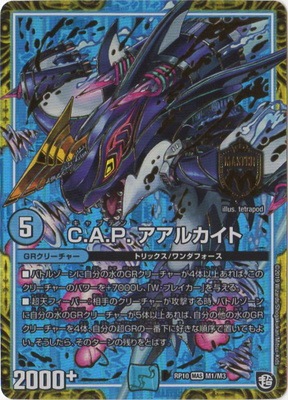 《C.A.P.キャプテン アアルカイト》 † C.A.P. アアルカイト MAS 水文明 (5) GRクリーチャー:トリックス/ワンダフォース 2000+ バトルゾーンに自分の水のGRクリーチャーが4体以上あれば、このクリーチャーのパワーを+7000し、「W・ブレイカー」を与える。 超天フィーバー:相手のクリーチャーが攻撃する時、バトルゾーンに自分の水のGRクリーチャーが5体以上あれば、自分の他の水のGRクリーチャーを4体、自分の超GRの一番下に好きな順序で置いてもよい。そうしたら、このターンの残りをとばす。
