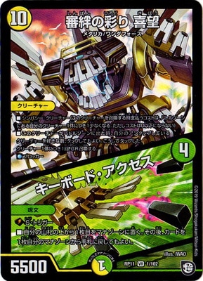 審絆の彩り 喜望 VR 光文明 (10) クリーチャー:メタリカ/ワンダフォース 5500 シンパシー:クリーチャー(このクリーチャーを召喚する時支払うコストは、バトルゾーンにある自分のクリーチャー1体につき1少なくなる。ただしコストは0以下にならない) このクリーチャーがバトルゾーンに出た時、自分のアンタップしているクリーチャーを好きな数、タップしてもよい。こうしてタップしたクリーチャー1体につき1回、GR召喚する。 ブロッカー キーボード・アクセス VR 自然文明 (4) 呪文 S・トリガー 自分の山札の上から1枚目をマナゾーンに置く。その後、カードを1枚自分のマナゾーンから手札に戻してもよい。