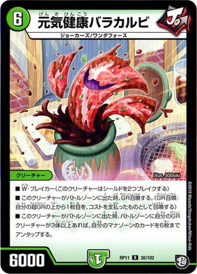 元気健康バラカルビ R 自然文明 (6) クリーチャー:ジョーカーズ/ワンダフォース 6000 W・ブレイカー(このクリーチャーはシールドを2つブレイクする) このクリーチャーがバトルゾーンに出た時、GR召喚する。(GR召喚:自分の超GRの上から1枚目を、コストを支払ったものとして召喚する) このクリーチャーがバトルゾーンに出た時、バトルゾーンに自分のGRクリーチャーが3体以上あれば、自分のマナゾーンにあるカードを6枚までアンタップする。