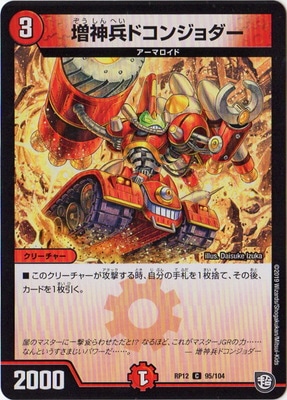 増神兵ドコンジョダー C 火文明 (3) クリーチャー:アーマロイド 2000 このクリーチャーが攻撃する時、自分の手札を1枚捨て、その後、カードを1枚引く。