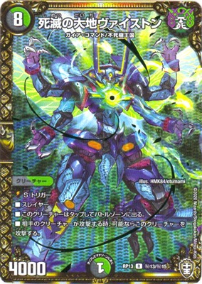 死滅の大地ヴァイストン R /自然文明 (8) クリーチャー:ガイア・コマンド/不死樹王国 4000 S・トリガー(このクリーチャーをシールドゾーンから手札に加える時、コストを支払わずにすぐ召喚してもよい) スレイヤー(このクリーチャーがバトルする時、バトルの後、相手クリーチャーを破壊する) このクリーチャーはタップしてバトルゾーンに出る。 相手のクリーチャーが攻撃する時、可能ならこのクリーチャーを攻撃する。
