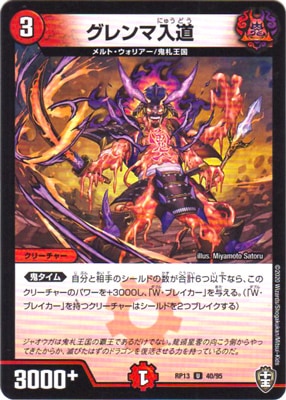 グレンマ入道 UC 火文明 (3) クリーチャー:メルト・ウォリアー/鬼札王国 3000+ <鬼タイム>自分と相手のシールドの数が合計6つ以下なら、このクリーチャーのパワーを+3000し、「W・ブレイカー」を与える。(「W・ブレイカー」を持つクリーチャーはシールドを2つブレイクする)