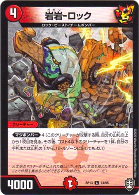 岩岩-ロック C 火文明 (4) クリーチャー:ロック・ビースト/チームボンバー 4000 <マジボンバー>4(このクリーチャーが攻撃する時、自分の山札の上から1枚目を見る。その後、コスト4以下のクリーチャーを1体、自分の手札または山札の上から、バトルゾーンに出してもよい)