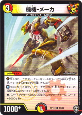 機機-メーカ C /火文明 (3) クリーチャー:アーマロイド/チームボンバー 1000+ S・トリガー(このクリーチャーをシールドゾーンから手札に加える時、コストを支払わずにすぐ召喚してもよい) ブロッカー(このクリーチャーをタップして、相手クリーチャーの攻撃先をこのクリーチャーに変更してもよい) パワーアタッカー+2000(攻撃中、このクリーチャーのパワーを+2000する)