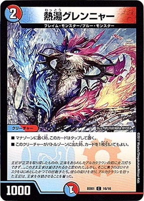 熱湯グレンニャー C /火文明 (2) クリーチャー:フレイム・モンスター/ブルー・モンスター 1000 マナゾーンに置く時、このカードはタップして置く。 このクリーチャーをバトルゾーンに出した時、カードを1枚引いてもよい