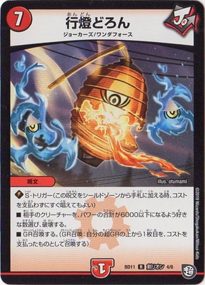 行燈どろん R 火文明[ジョーカーズ] (7) 呪文:ジョーカーズ/ワンダフォース S・トリガー(この呪文をシールドゾーンから手札に加える時、コストを支払わずにすぐ唱えてもよい) 相手のクリーチャーを、パワーの合計が6000以下になるよう好きな数選び、破壊する。 GR召喚する。(GR召喚:自分の超GRの上から1枚目を、コストを支払ったものとして召喚する)