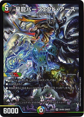 星龍パーフェクト・アース SR ////自然文明 (5) クリーチャー:ワールド・ドラゴン 6000 マナゾーンに置く時、このカードはタップして置く。 自分の手札に加えられるシールドカードはすべて「S・トリガー」を得る。 W・ブレイカー
