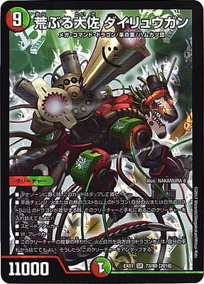 荒ぶる大佐 ダイリュウガン SR /自然文明 (9) クリーチャー:メガ・コマンド・ドラゴン/革命軍/ハムカツ団 11000 マナゾーンに置く時、このカードはタップして置く。 革命チェンジ:火または自然のコスト5以上のドラゴン(自分の火または自然のコスト5以上のドラゴンが攻撃する時、そのクリーチャーと手札にあるこのクリーチャーを入れ替えてもよい) スピードアタッカー W・ブレイカー このクリーチャーの攻撃の終わりに、火と自然を両方持つドラゴンを1体、自分の手札から捨ててもよい。そうしたら、このクリーチャーをアンタップする。