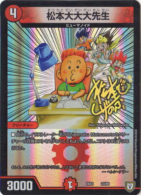 松本大大大先生 P 火文明 (4) クリーチャー:ヒューマノイド 3000 自分の、イラストレーター名がShigenobu Matsumotoのクリーチャーの召喚コストを1少なくしてもよい。ただし、コストは0以下にならない。