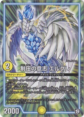 制圧の意志 エルグレ P 光文明 (2) GRクリーチャー:メタリカ/ワンダフォース 2000 このクリーチャーがバトルゾーンを離れた時、相手のクリーチャーを1体選び、タップする。 (ゲーム開始時、GRクリーチャーは山札には含めず、自分の超GRに置き、バトルゾーン以外のゾーンに行った場合、超GRの一番下に戻す)