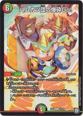 ハムカツ団の爆砕Go! R /自然文明 (6) 呪文 S・トリガー 次のうちいずれか1つを選ぶ。 ?相手のパワー3000以下のクリーチャーをすべて破壊する。 ?バトルゾーンにあるカードを1枚選び、持ち主のマナゾーンに置く。