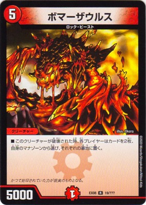 ボマーザウルス R 火文明 (5) クリーチャー:ロック・ビースト 5000 このクリーチャーが破壊された時、各プレイヤーはカードを2枚、自身のマナゾーンから選び、それぞれの墓地に置く。