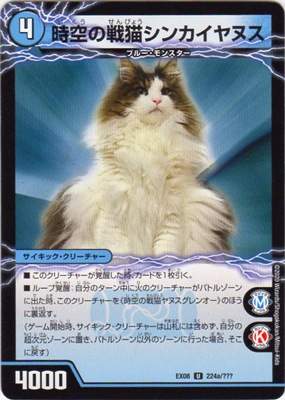 時空の戦猫シンカイヤヌス UC 水文明 (4) サイキック・クリーチャー:ブルー・モンスター 4000 M・ソウル K・ソウル このクリーチャーに覚醒した時、カードを1枚引く。 ループ覚醒?自分のターン中に火のクリーチャーをバトルゾーンに出した時、このクリーチャーを《時空の戦猫ヤヌスグレンオー》のほうに裏返す。 覚醒後⇒《時空の戦猫ヤヌスグレンオー》 時空の戦猫ヤヌスグレンオー UC 火文明 (4) サイキック・クリーチャー:フレイム・モンスター 4000+ M・ソウル K・ソウル このクリーチャーに覚醒した時、バトルゾーンにある自分のクリーチャーを1体選ぶ。そのターン、そのクリーチャーは「パワーアタッカー+2000」と「スピードアタッカー」を得る。 ループ覚醒?自分のターン中に水のクリーチャーをバトルゾーンに出した時、このクリーチャーを《時空の戦猫シンカイヤヌス》のほうに裏返す。 覚醒後⇒《時空の戦猫シンカイヤヌス》
