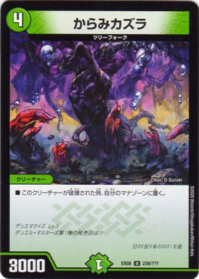 からみカズラ UC 自然文明 (4) クリーチャー:ツリーフォーク 3000 このクリーチャーが破壊された時、自分のマナゾーンに置く。