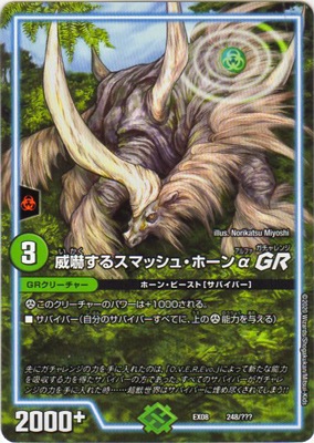 威嚇するスマッシュ・ホーンαGR P 火文明 (3) GRクリーチャー:ホーン・ブースト[サバイバー] 2000+ SV-このクリーチャーのパワーは+1000される。 サバイバー(自分のサバイバーすべてに、上のSV能力を与える)