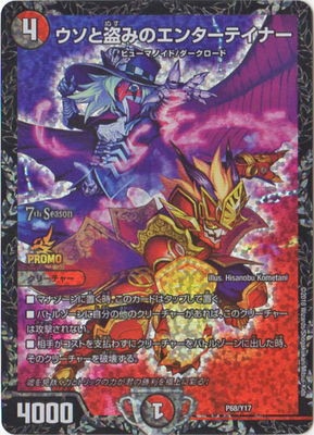 ウソと盗みのエンターテイナー P /火文明 (4) クリーチャー:ヒューマノイド/ダークロード 4000 バトルゾーンに自分の他のクリーチャーがあれば、このクリーチャーは攻撃されない。 相手がコストを支払わずにクリーチャーをバトルゾーンに出した時、そのクリーチャーを破壊する。