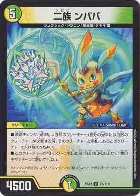 二族 ンババ UC /自然文明 (5) クリーチャー:ジュラシック・ドラゴン/革命軍/ダママ団 4500 革命チェンジ―光または自然のクリーチャー(自分の光または自然のクリーチャーが攻撃する時、そのクリーチャーと手札にあるこのクリーチャーを入れ替えてもよい) このクリーチャーがバトルゾーンに出た時、自分の山札の上から1枚目をマナゾーンに置いてもよい。