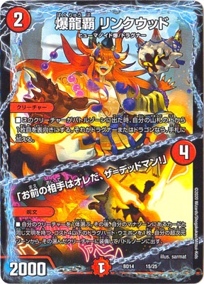 爆龍覇 リンクウッド P 火文明 (2) クリーチャー:ヒューマノイド爆/ドラグナー 2000 このクリーチャーがバトルゾーンに出た時、自分の山札の上から1枚目を表向きにする。それがドラグナーまたはドラゴンなら、手札に加える。