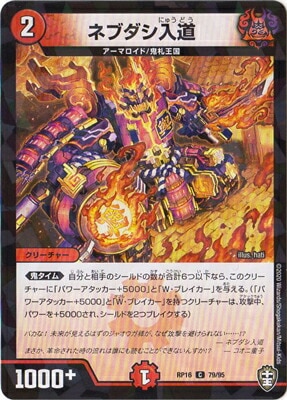 ネブダシ入道 C 火文明 (2) クリーチャー:アーマロイド/鬼札王国 1000+ <鬼タイム>自分と相手のシールドの数が合計6つ以下なら、このクリーチャーに「パワーアタッカー+5000」と「W・ブレイカー」を与える。(「パワーアタッカー+5000」と「W・ブレイカー」を持つクリーチャーは、攻撃中、パワーを+5000され、シールドを2つブレイクする)